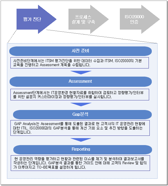 | Æò°¡Áø´Ü ´Ü°è´Â ITIL ¹× ISO20000±Ô°Ý¿¡ ÀǰÅÇÑ ÇöÇà IT¿î¿µ°ü¸® ¿ª·®À» ºÐ¼®, Áø´ÜÇÏ´Â ´Ü°è·Î »çÀüÁغñ, Assessment, GAPºÐ¼®, ReportingÀÇ ÀýÂ÷·Î ÀÌ·ç¾î Áý´Ï´Ù.